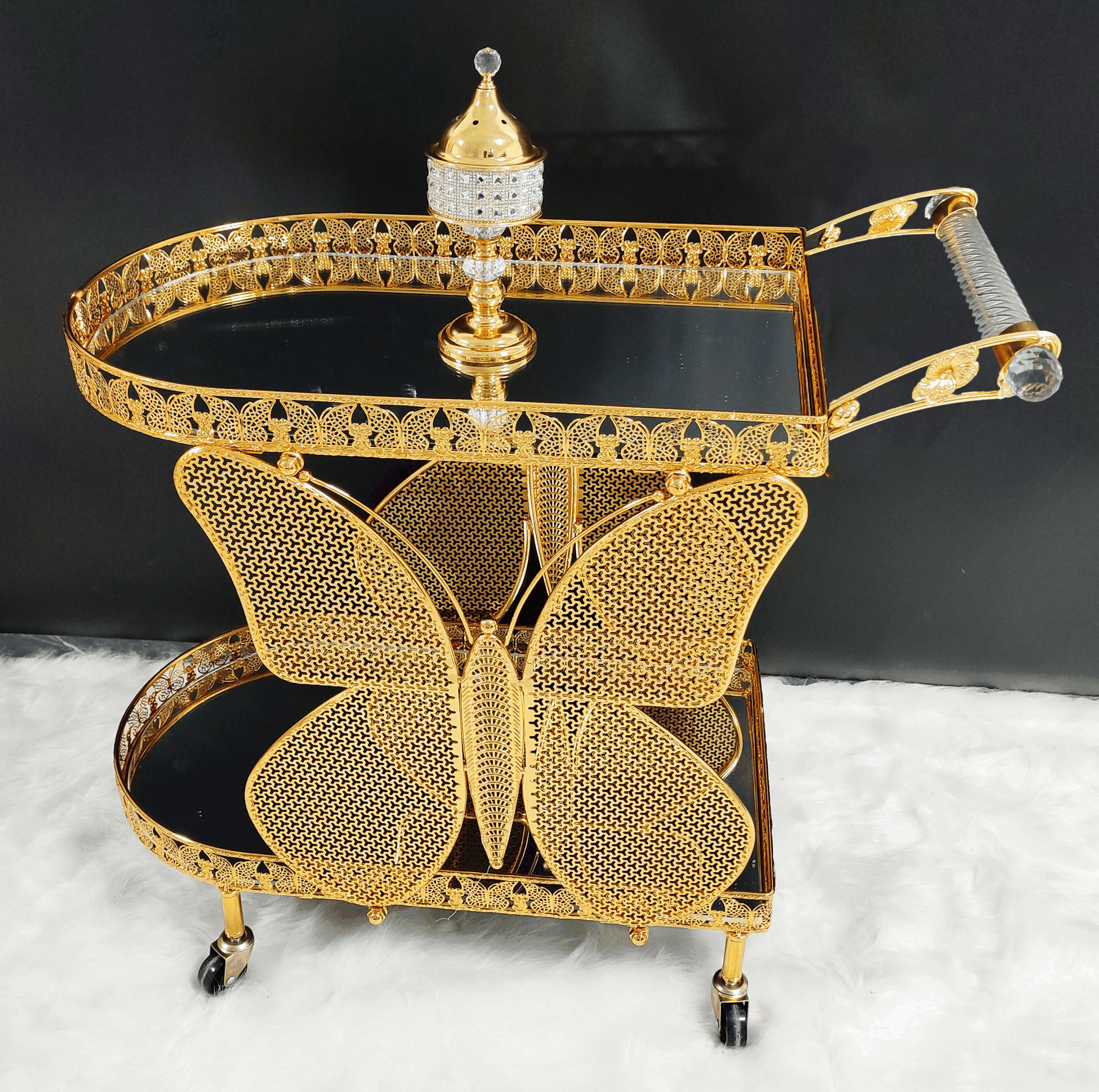 Butterfly-Inspired Golden Crystal Serving Trolley (QBY-80232) – A Symbol of Happiness for Indian Homes