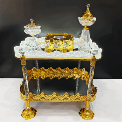 - Diamond Accents: The table edges and incense set are adorned with sparkling crystals, symbolizing purity (shuddhi) and wealth (dhana)—a beloved motif in Indian weddings and Diwali.