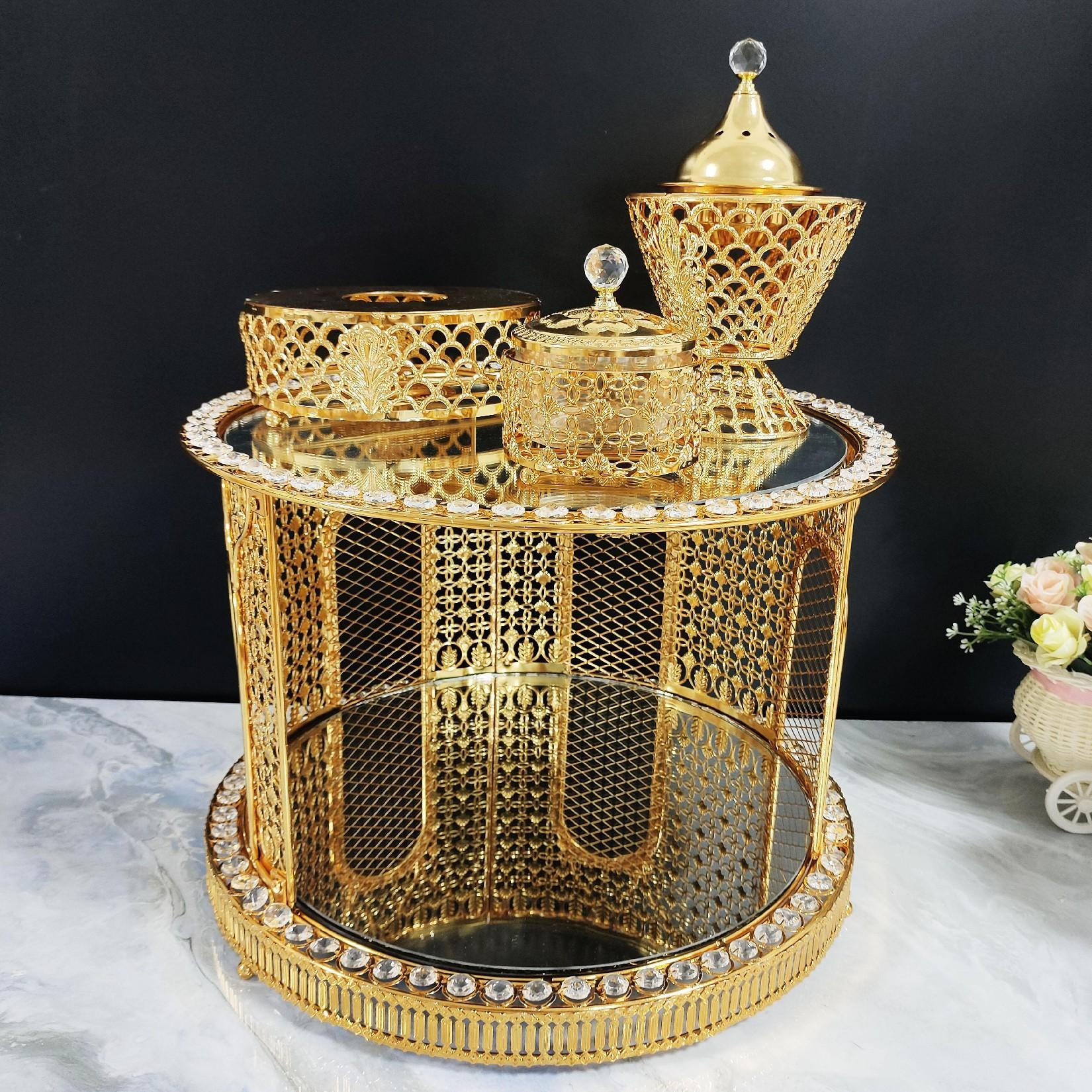 Round Diamond-Embedded Golden Iron Coffee Table with LED Incense Set (QBY-80272) – Sparkling Unity for Indian Homes